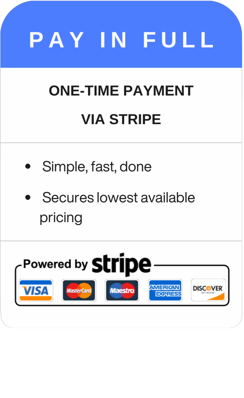 $1,800–$3,000 depending on destination and optional add-ons. Pay in full via Stripe or finance with Affirm starting at $67/month. Payment is processed at checkout.
