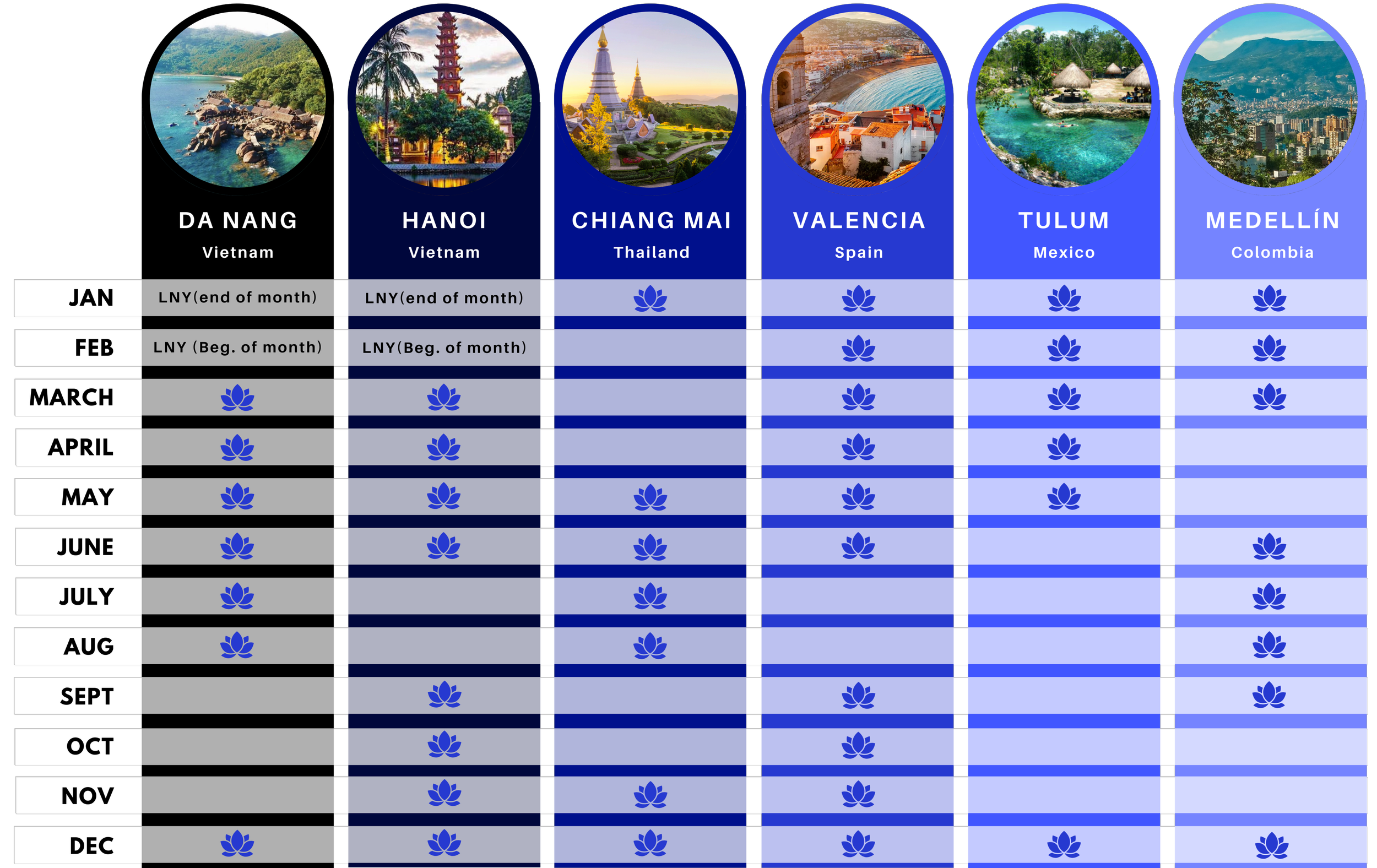 SE Asia camps in January and February may shift based on Lunar New Year. Exact timing changes every year.